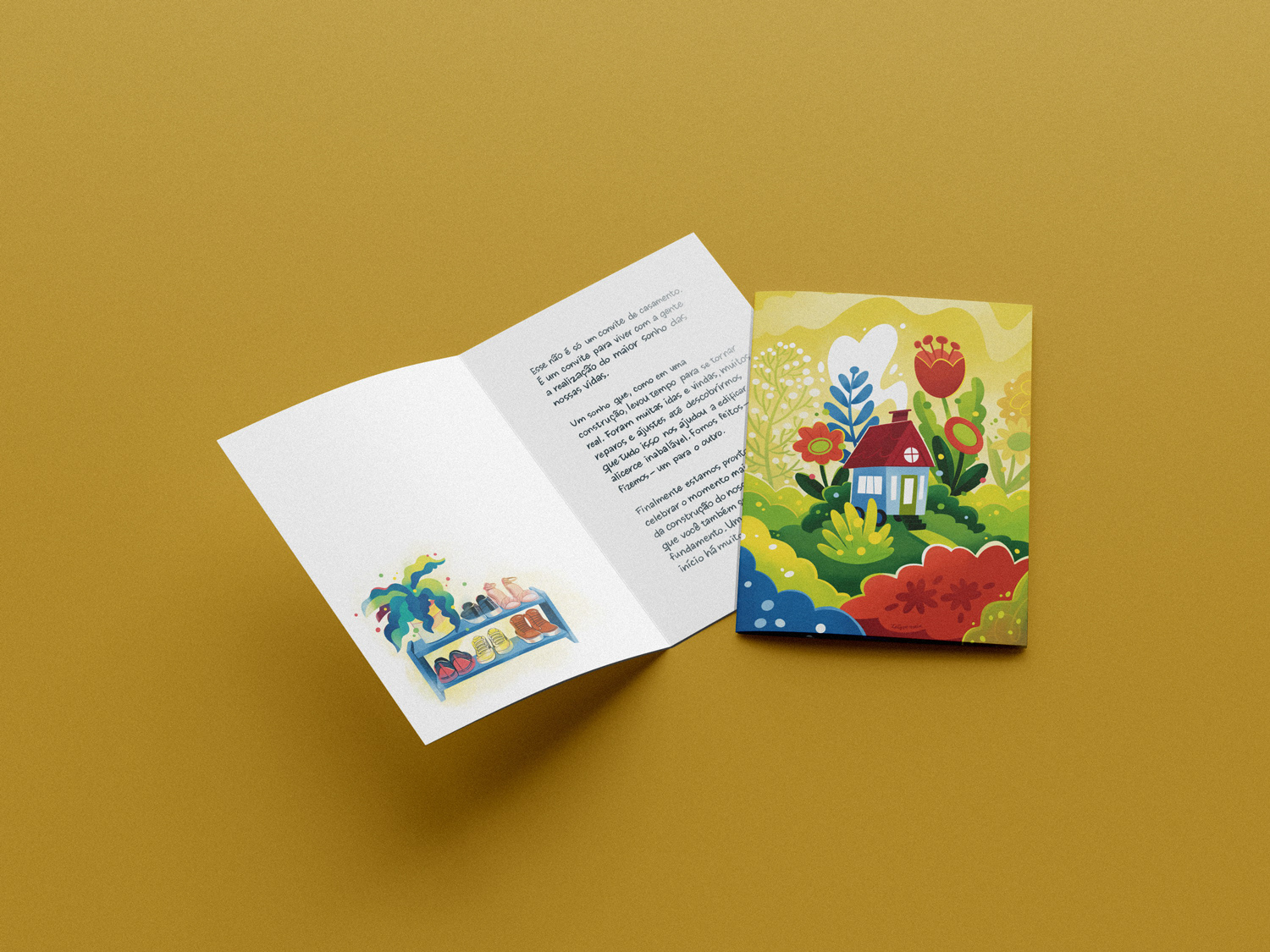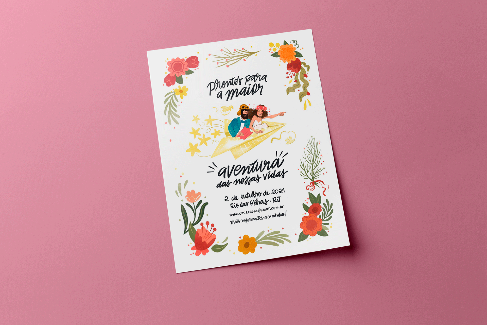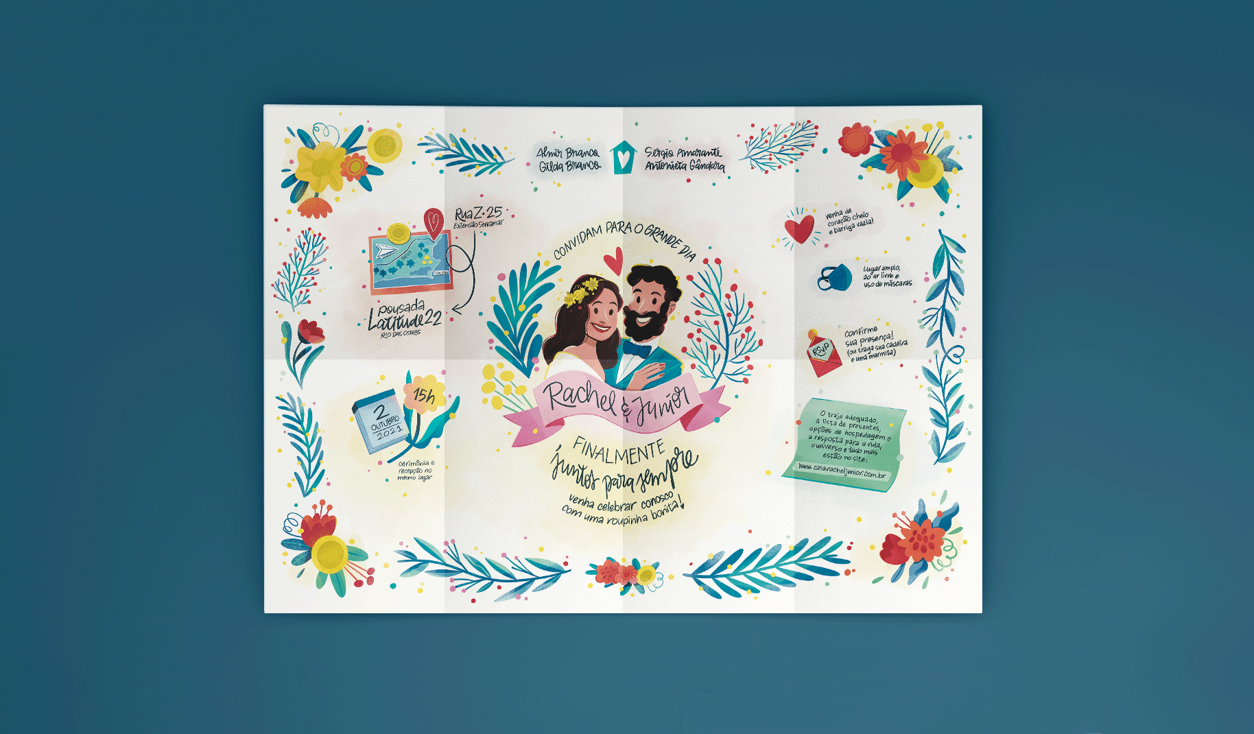 O convite conta a história de como os noivos se conheceram e se apaixonaram, até chegar num pôster com as informações pra festa, ilustrado em torno do tema “Home is wherever I’m with you”.