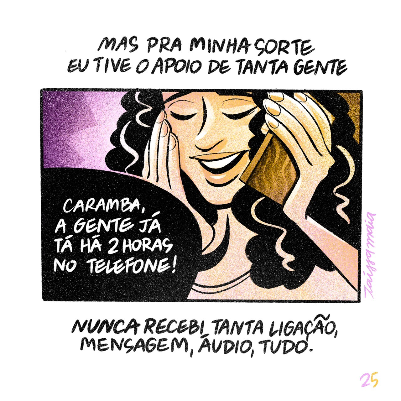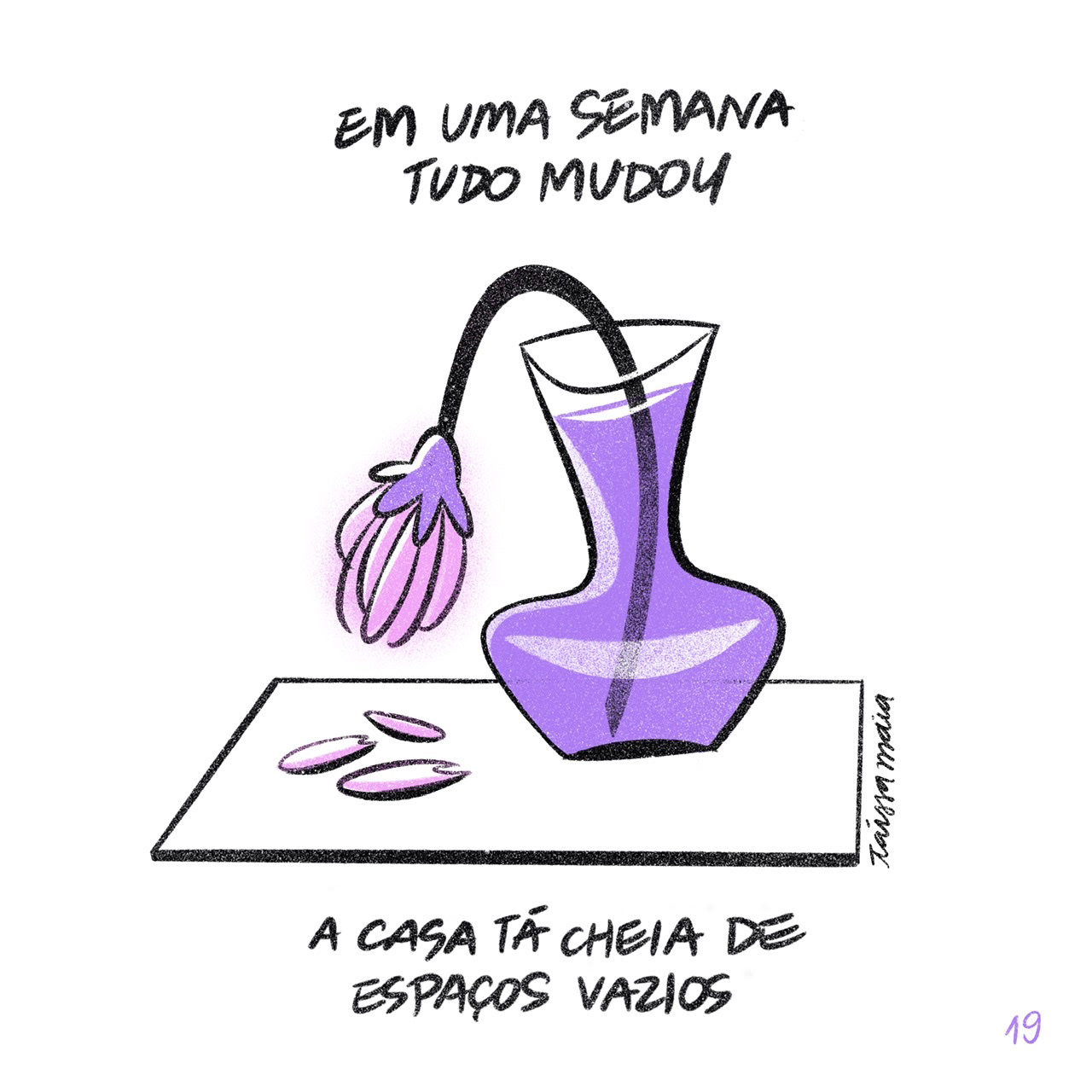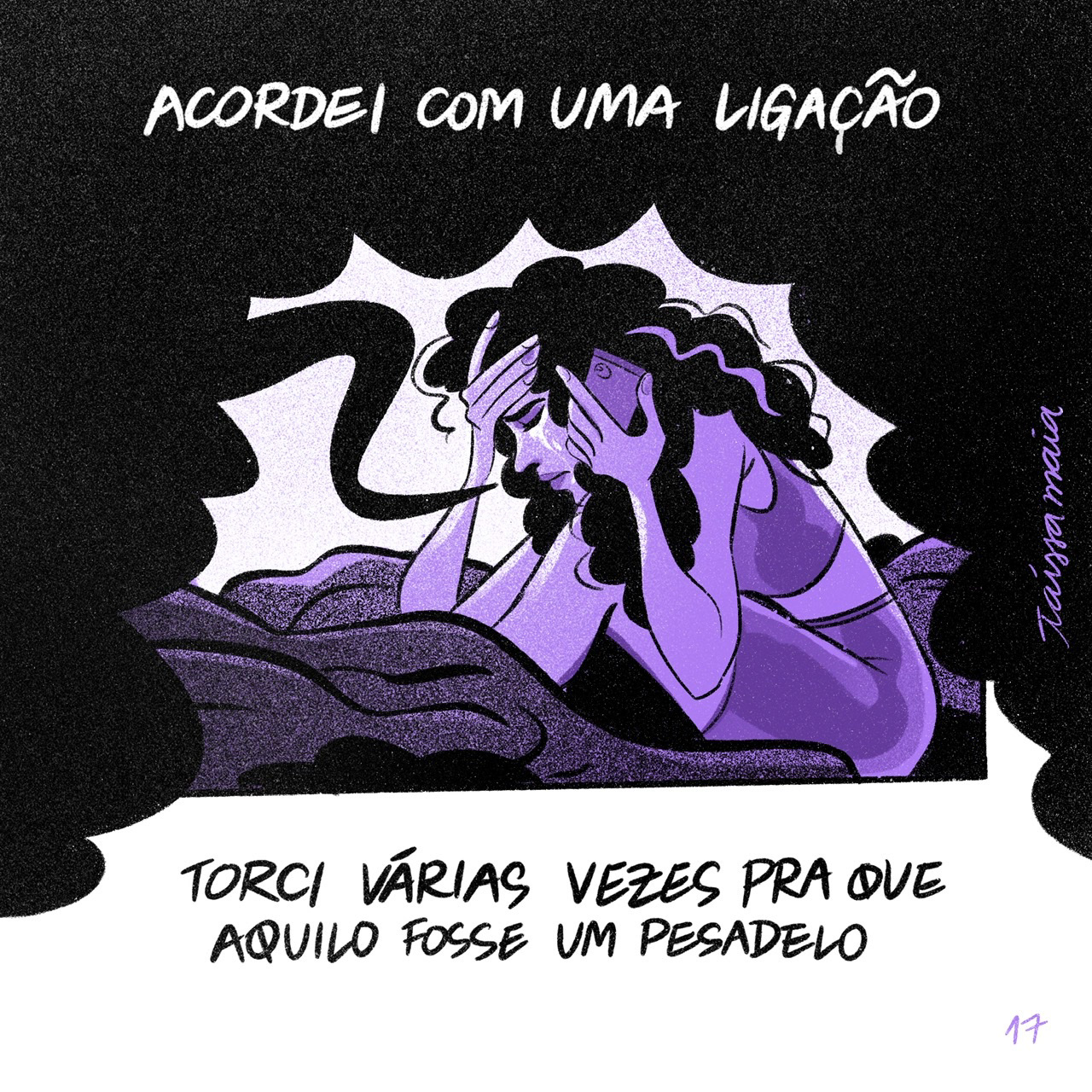 Um mês depois eu fiz esta série de ilustrações pra contar como tudo aconteceu, e postei a nossa história nas redes sociais, quadro a quadro e diariamente, com o objetivo de lidar com a minha própria dor, além de amparar e ajudar quem estivesse passando pela mesma situação.