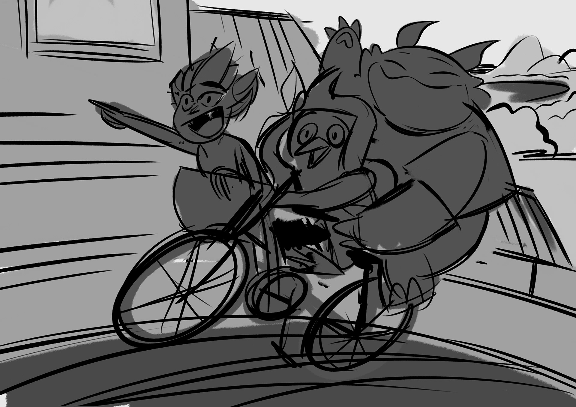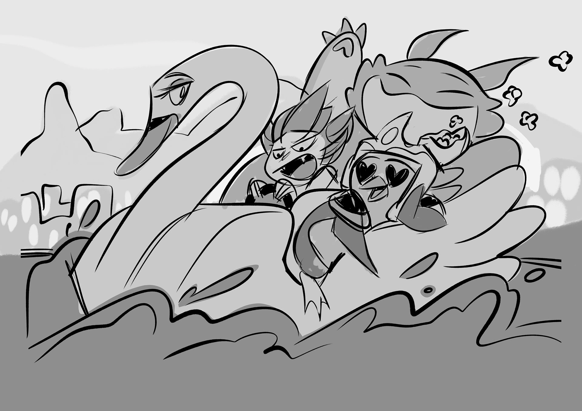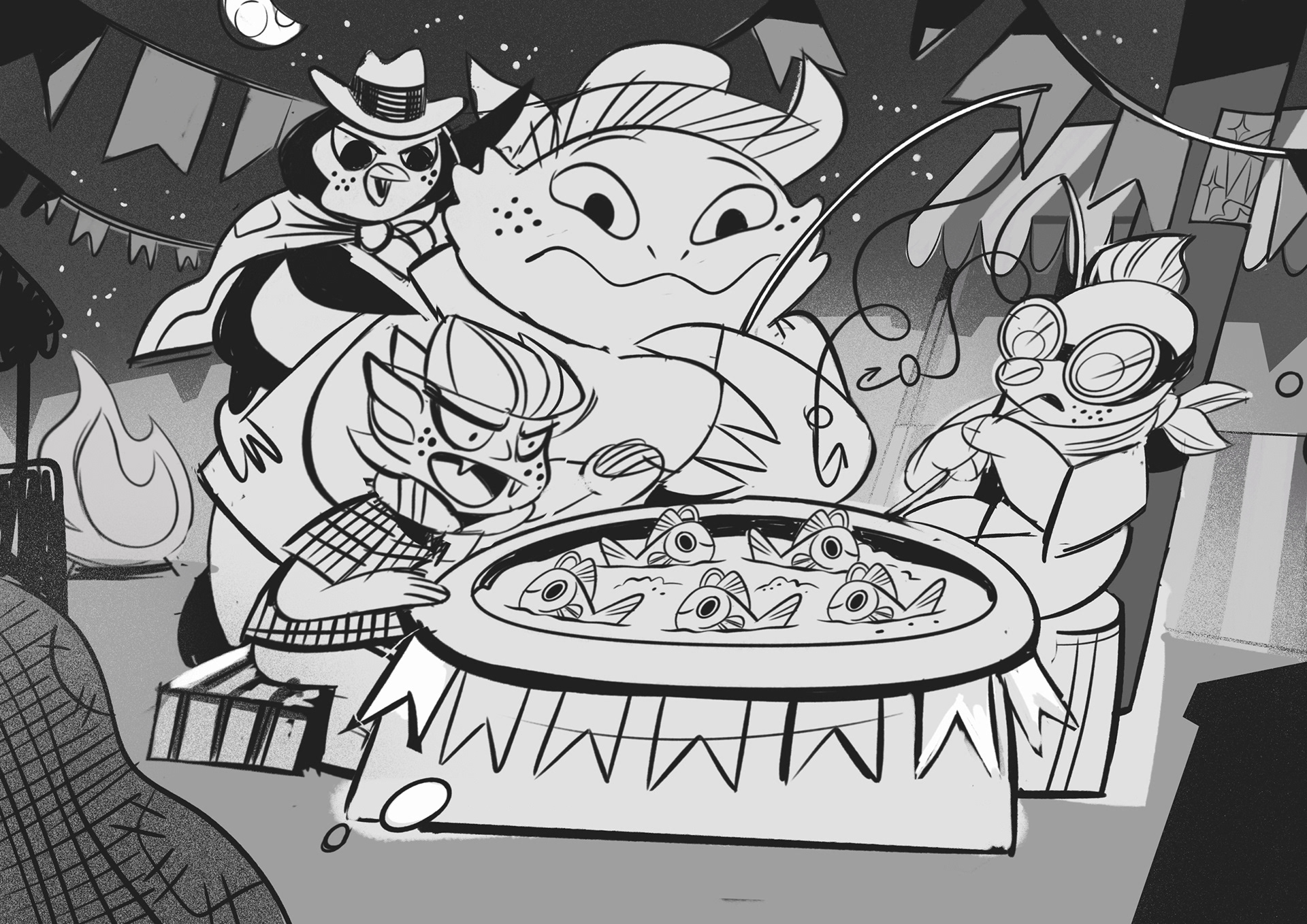 in this project, I should portrait Teamfight Tactics characters (Shisa, Featherknight and Choncc) in Brazilian scenarios. I came up with three sketches, and the third was the chosen one:
